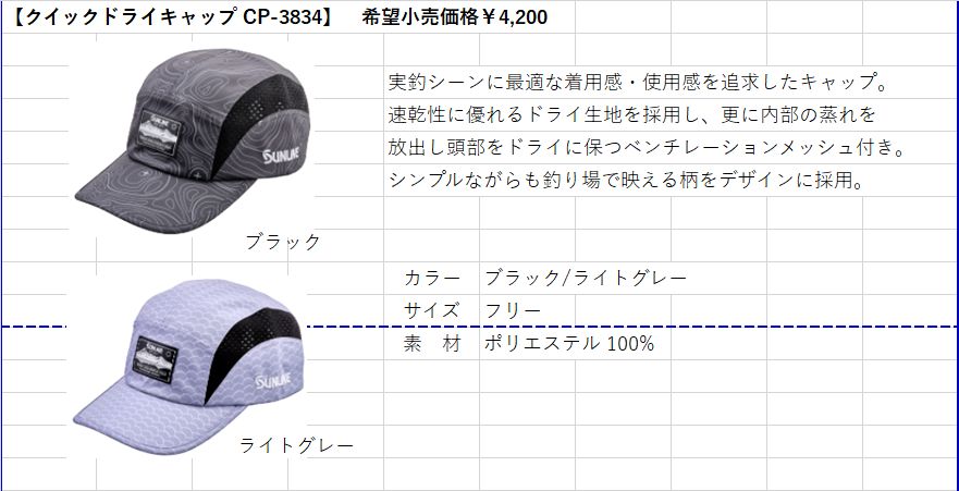 (28%引) サンライン クイックドライキャップ CP-3834 ブラック ライトグレー フィッシング 帽子 ウエア 磯釣り 鮎 船 ルアー 釣具 (2026年新製品予約4月発売)